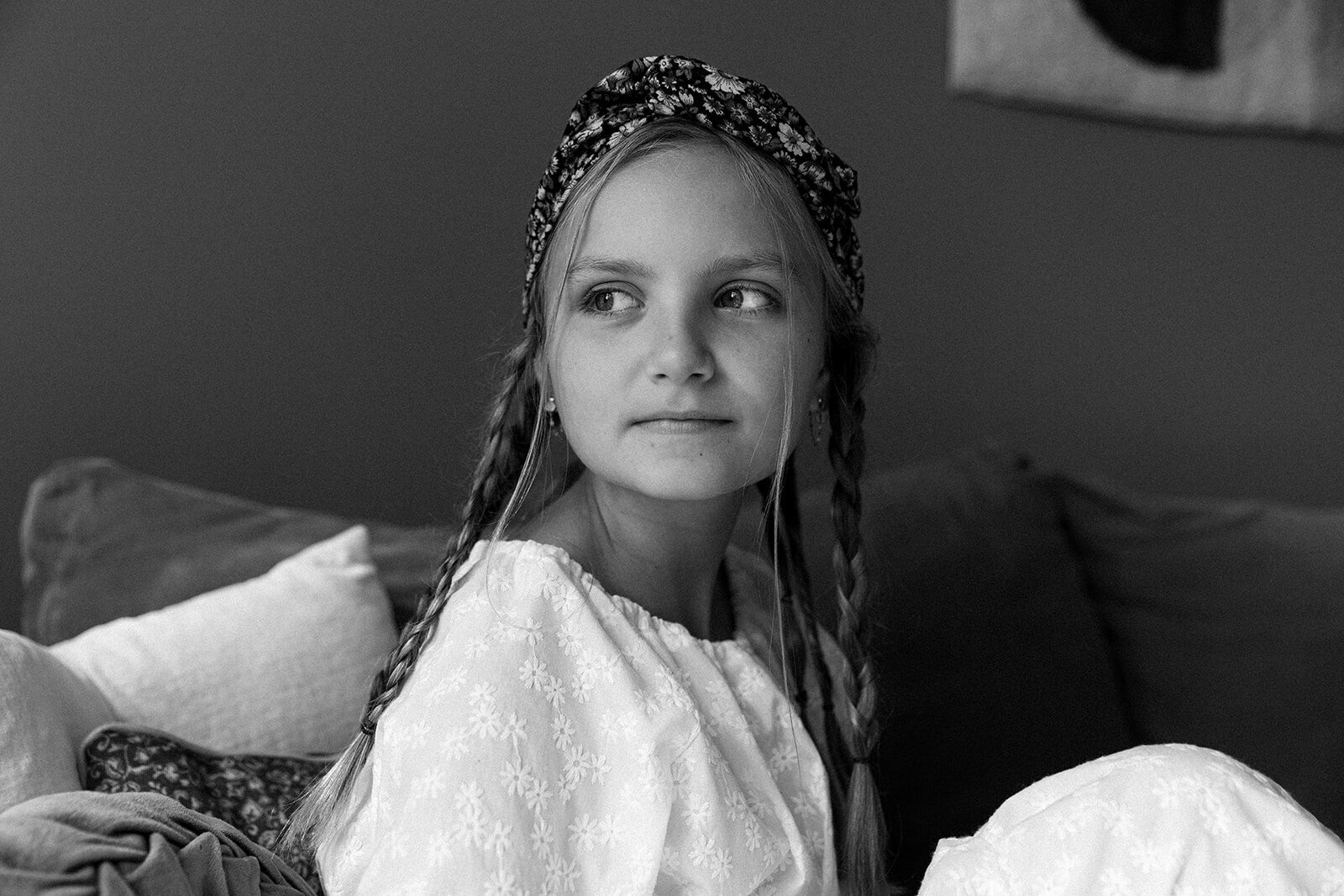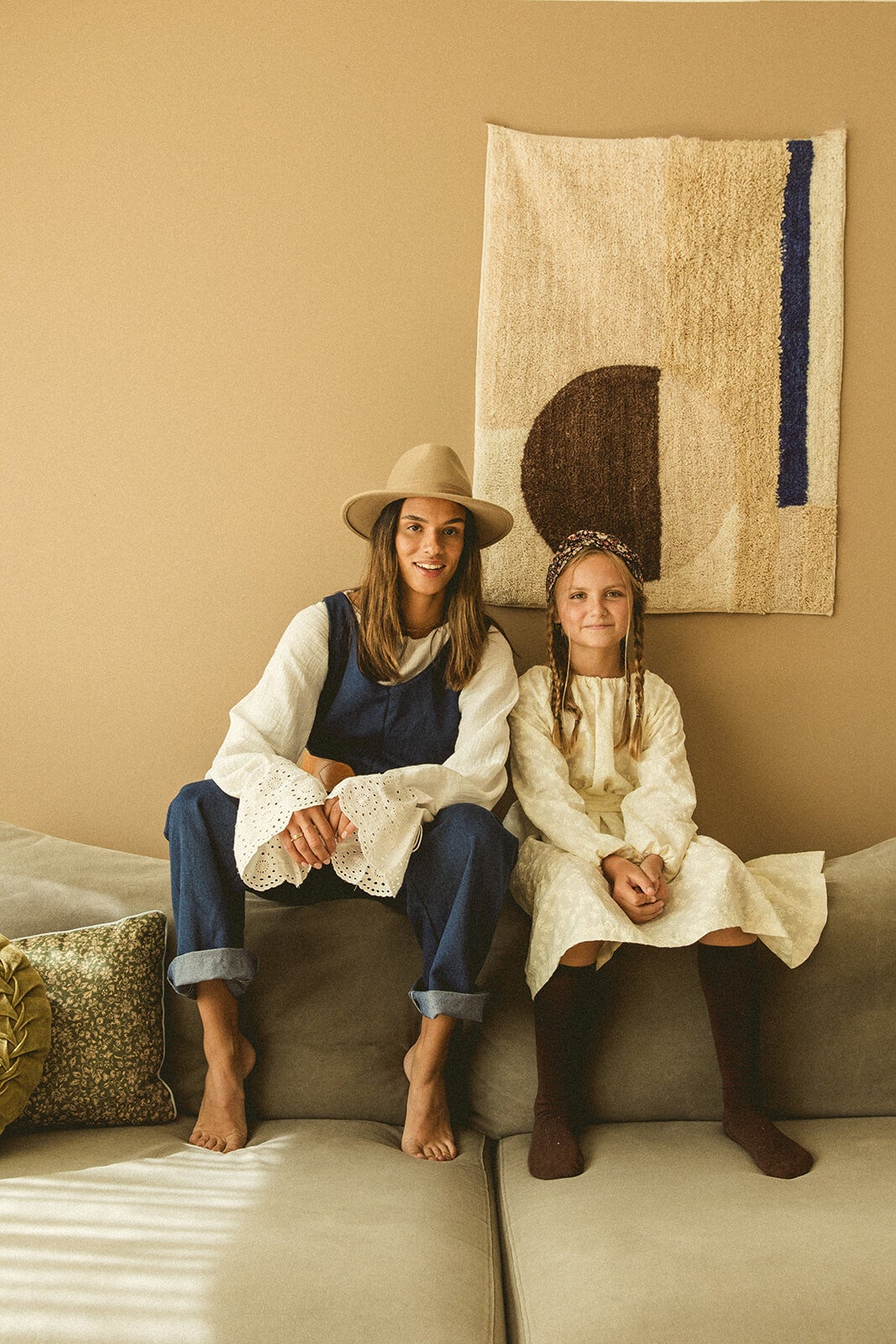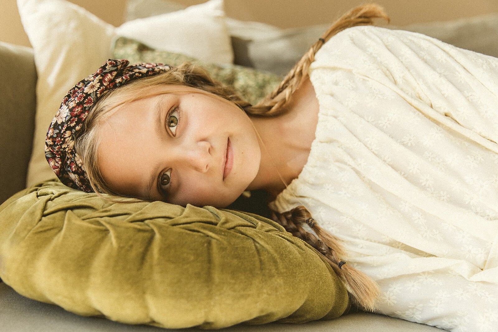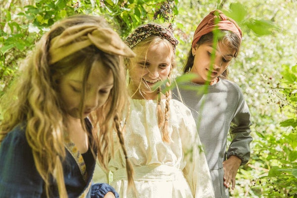 Britt draagt hier een jurk met geborduurde bloemen in een crèmekleurige tint, gemaakt van een dead-stock katoenen stof. De jurk is voorzien van een ceintuur die naar eigen voorkeur gedragen kan worden, bijvoorbeeld om de taille, maar ook leuk als haaraccessoire!
