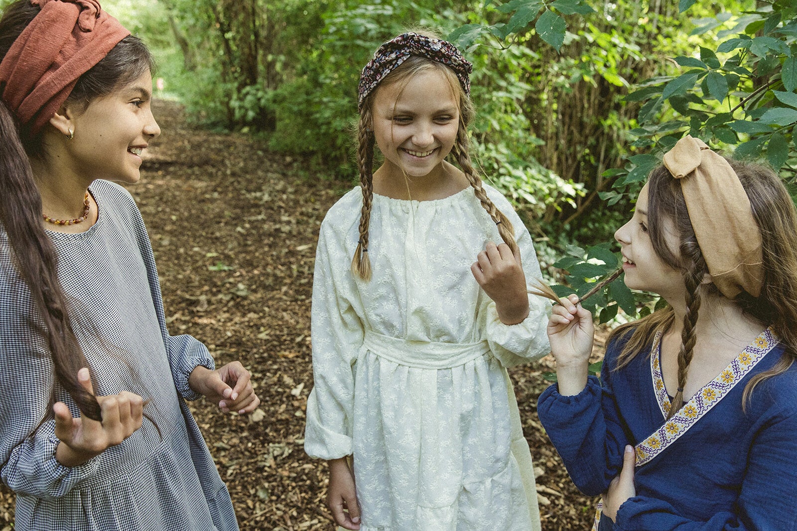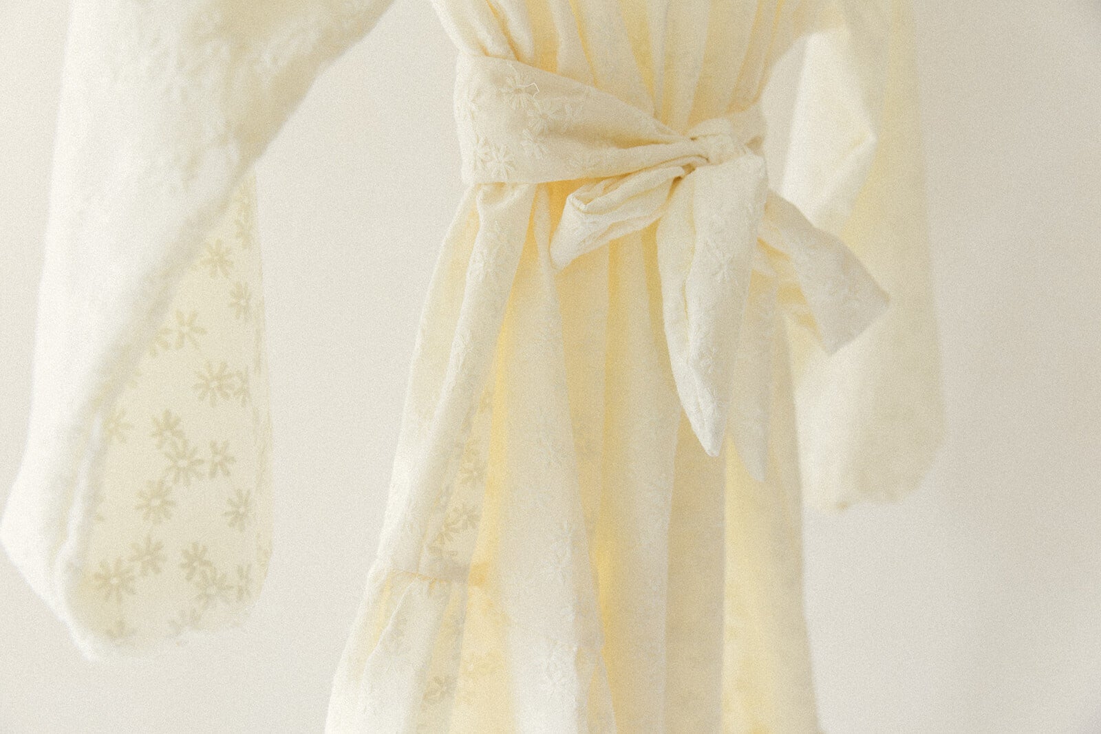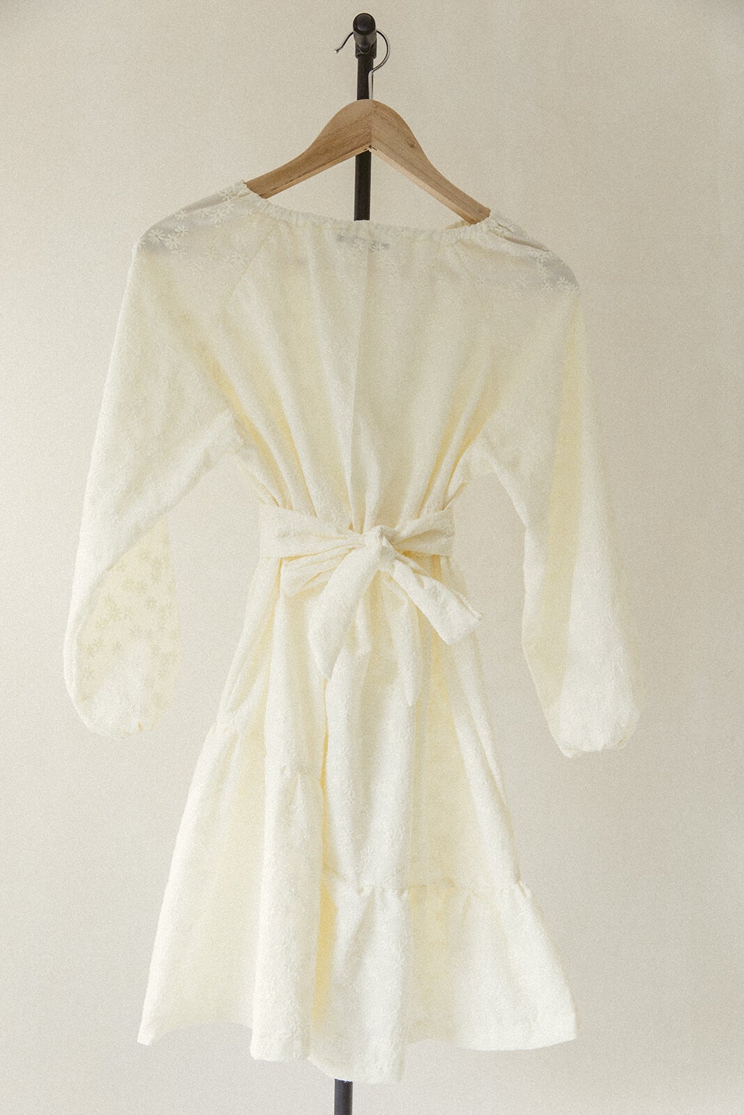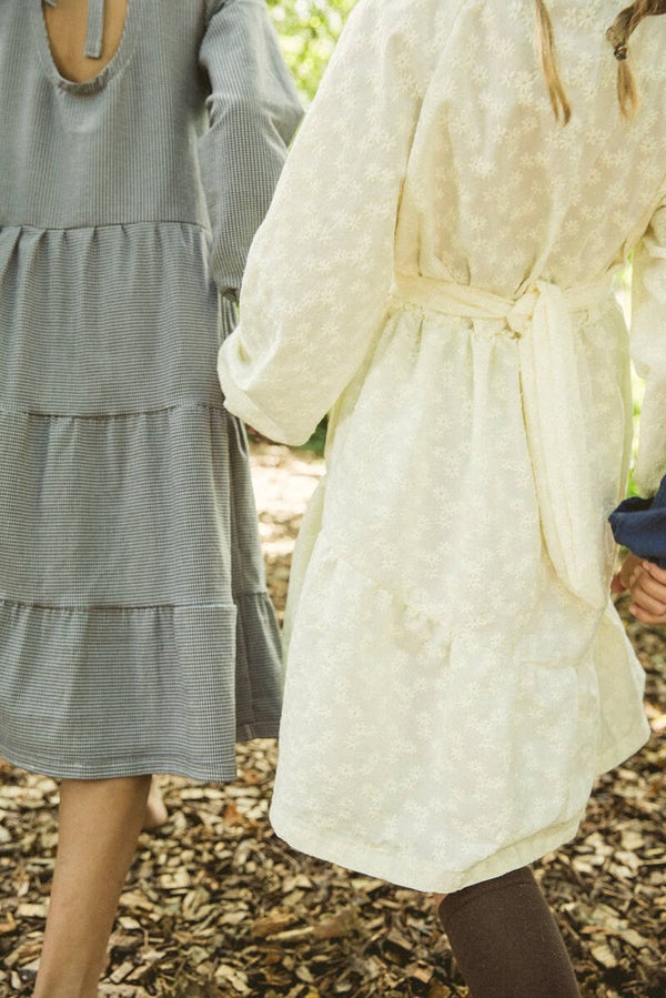 Britt is wearing a dress adorned with embroidered flowers in a creamy hue, crafted from deadstock cotton fabric. The dress comes with a belt that can be worn to your preference, whether around the waist or as a charming hair accessory!