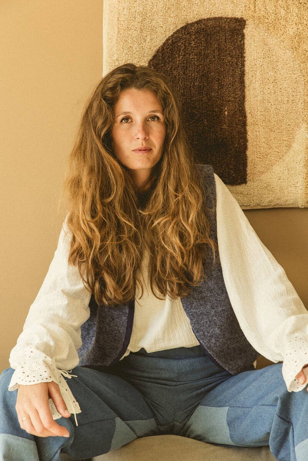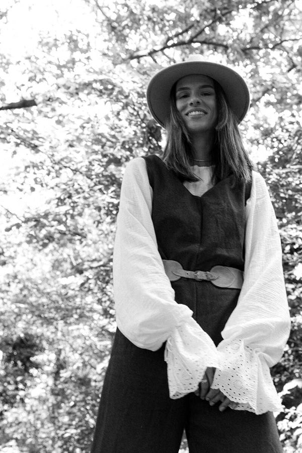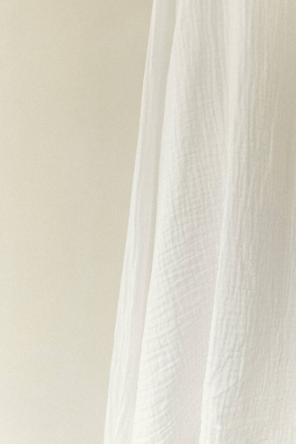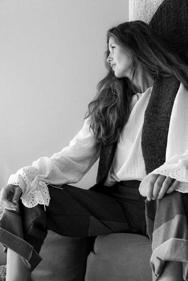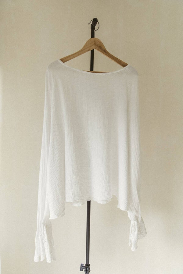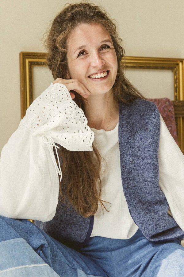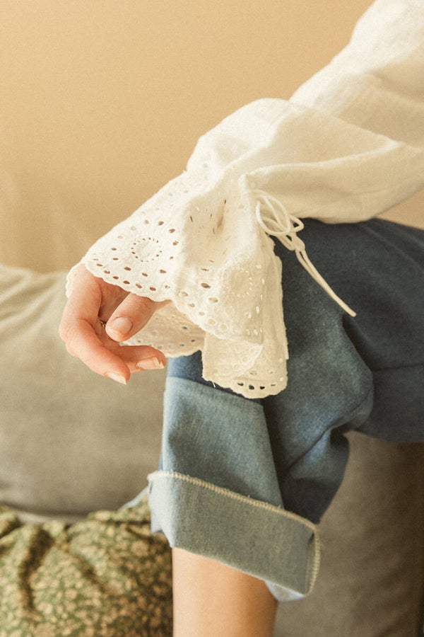 This blouse is crafted from double gauze organic cotton fabric adorned with beautiful embroidered flowers on the sleeves. The sleeves feature a cord woven through, allowing you to adjust the sleeve width to your preference.