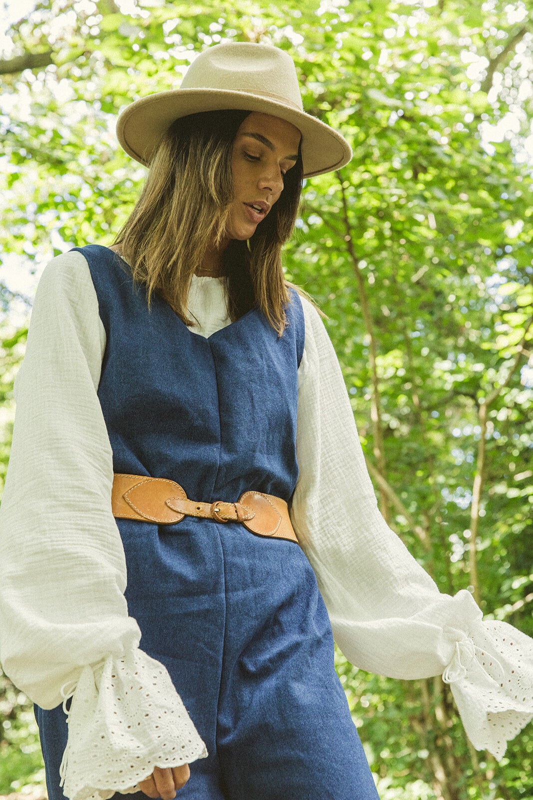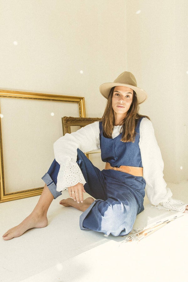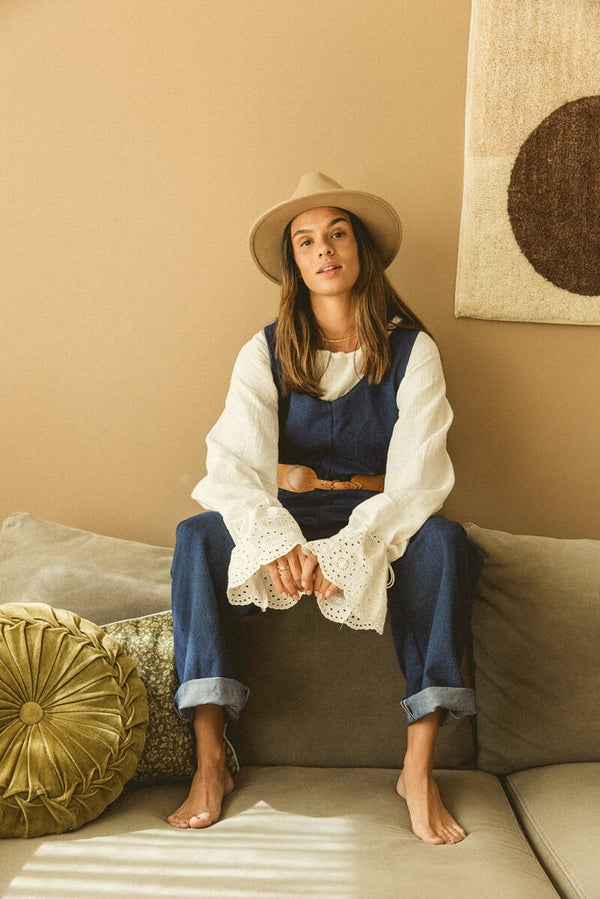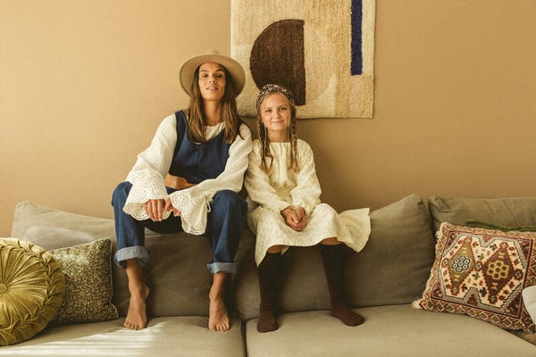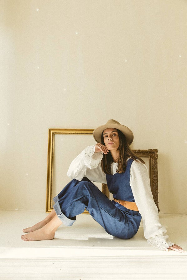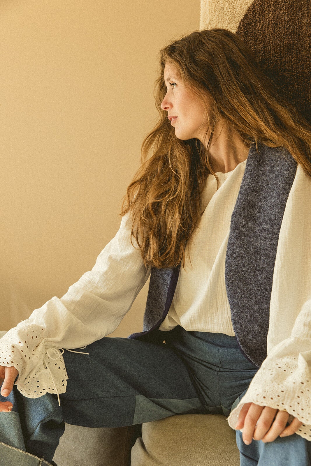 This blouse is crafted from double gauze organic cotton fabric adorned with beautiful embroidered flowers on the sleeves. The sleeves feature a cord woven through, allowing you to adjust the sleeve width to your preference.