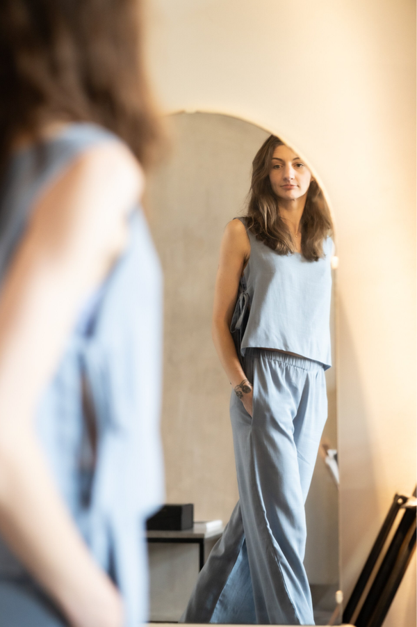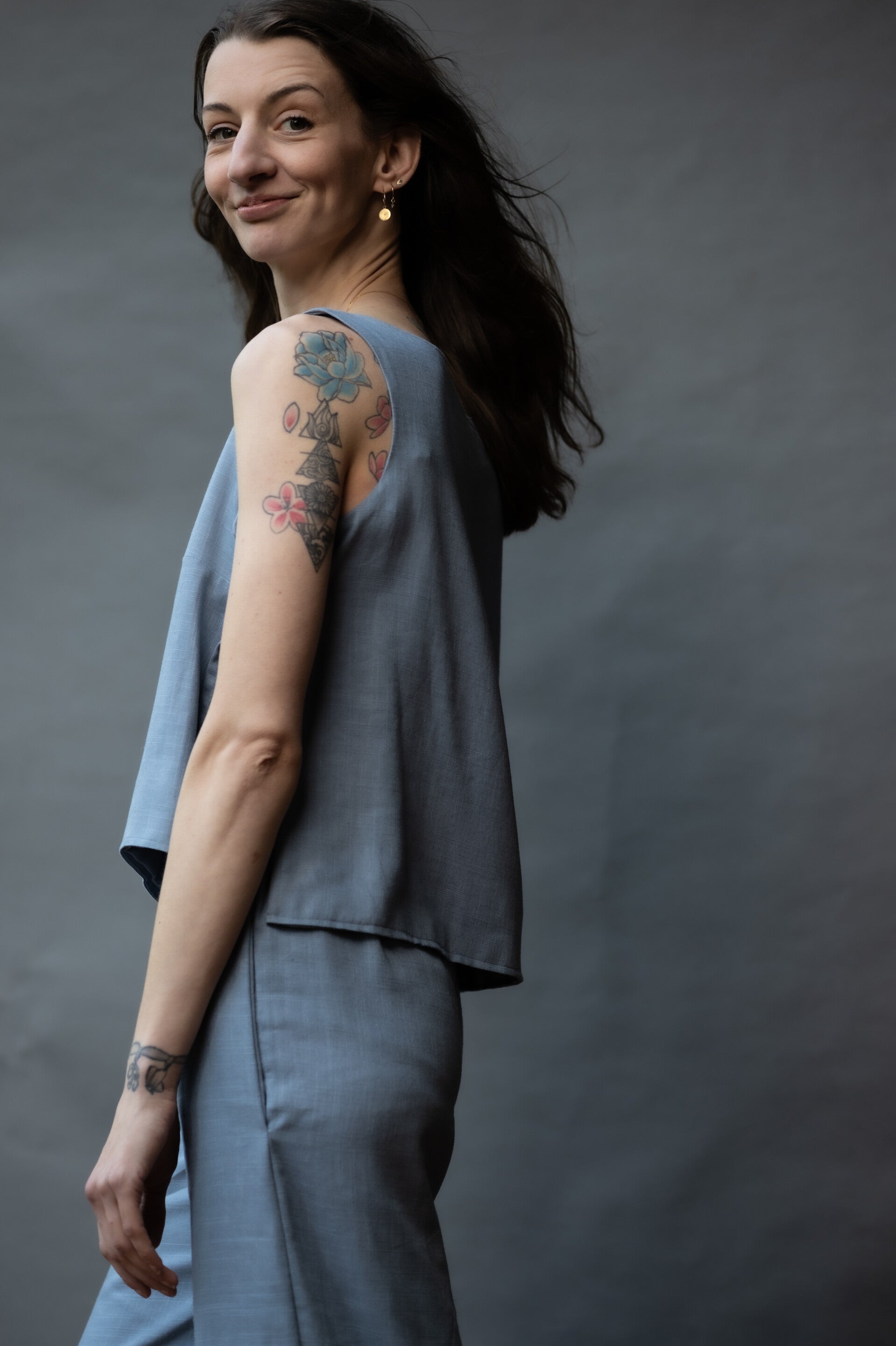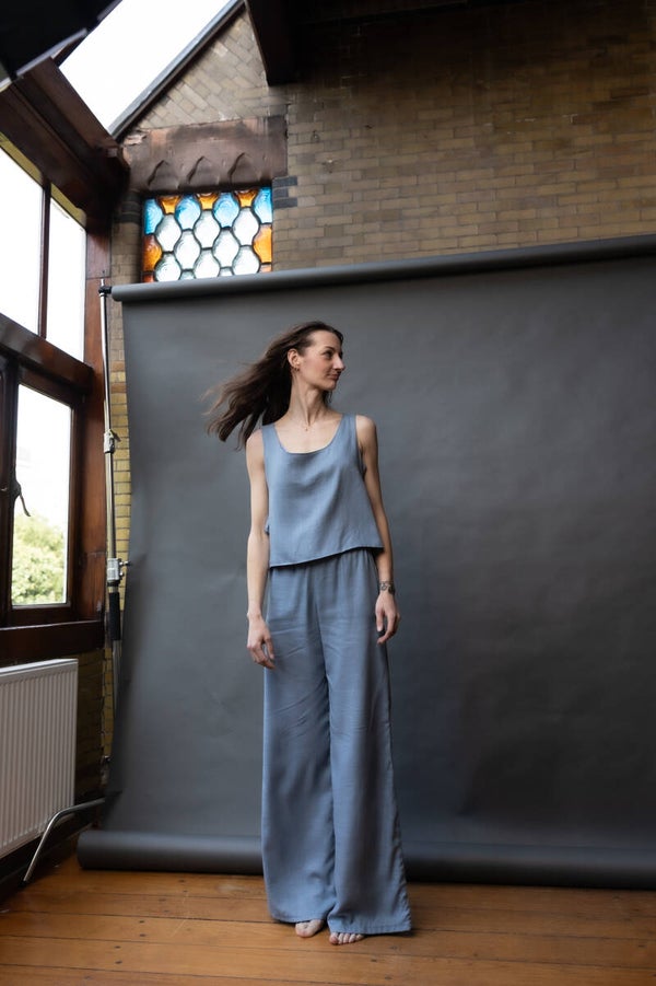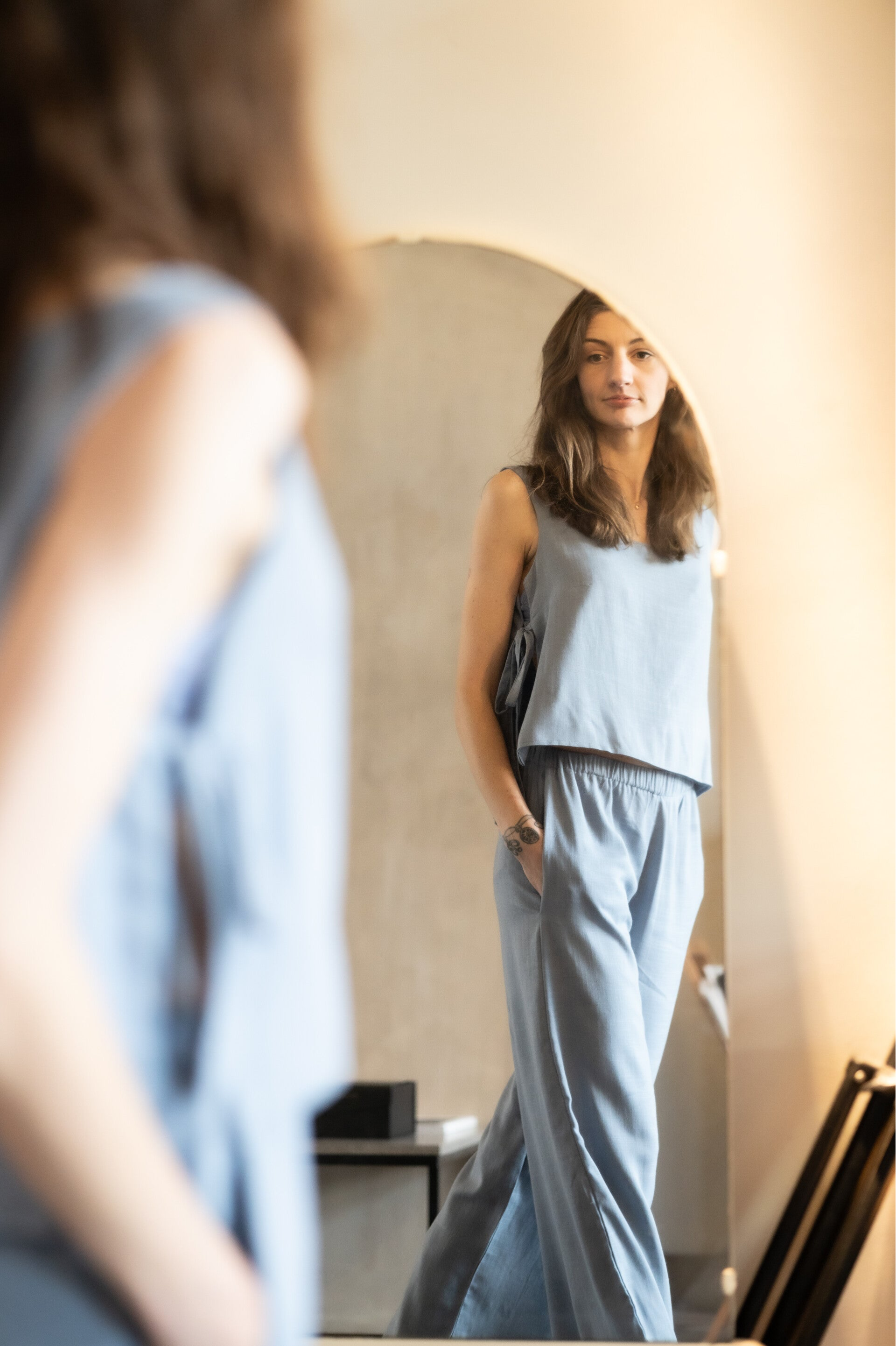 The cornflower suit is made from a deadstock linen viscose mix in the most beautiful color blue a real eye-catcher this summer