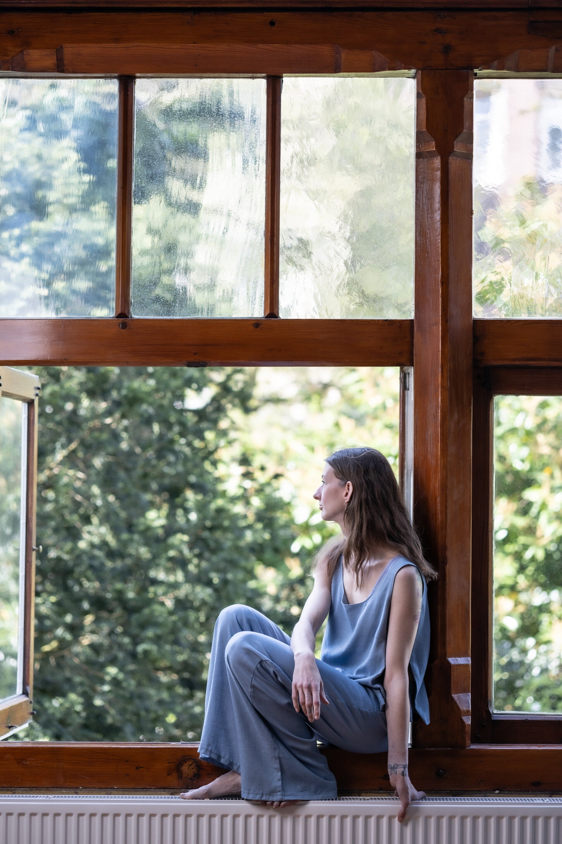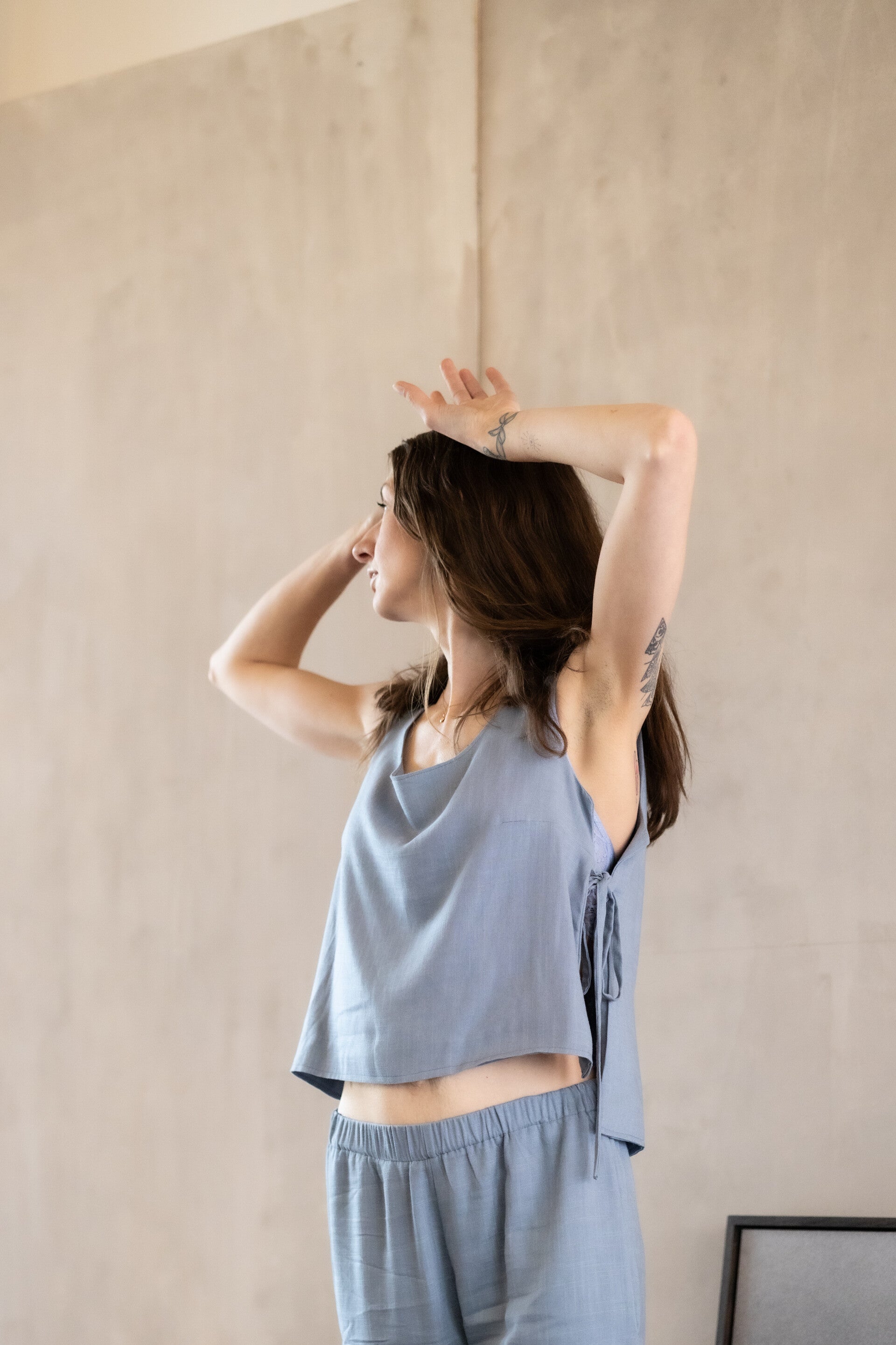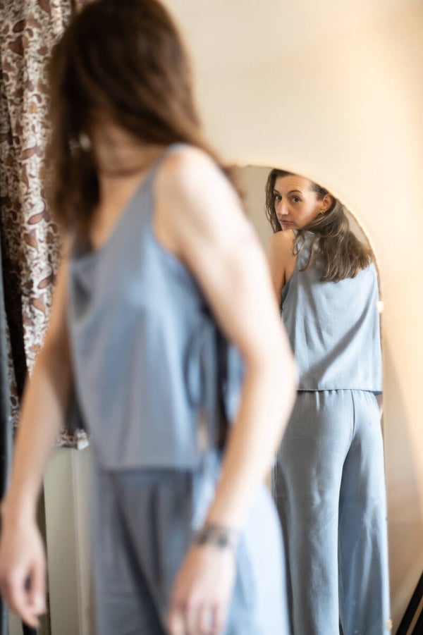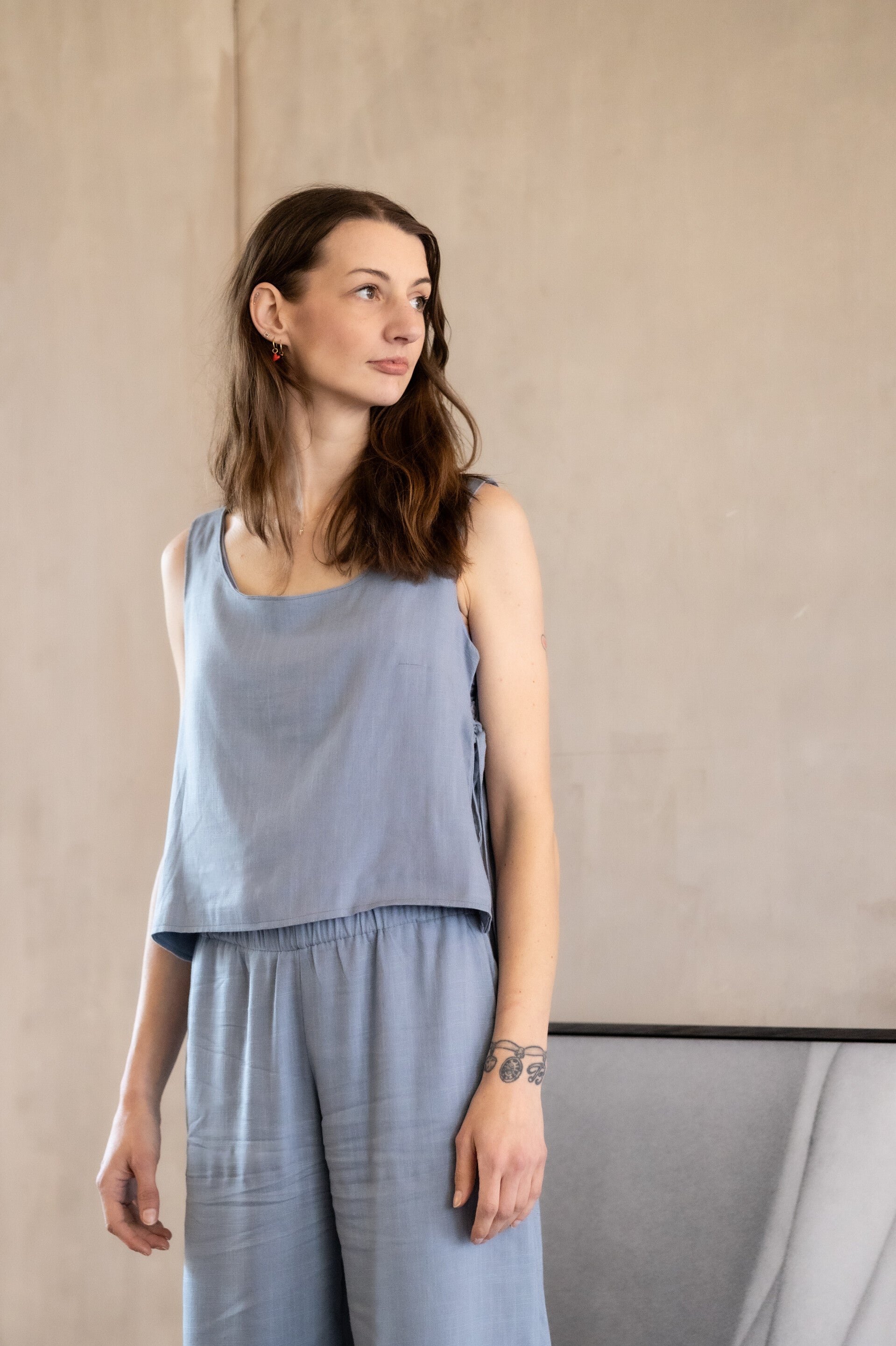The cornflower suit is made from a deadstock linen viscose mix in the most beautiful color blue a real eye-catcher this summer