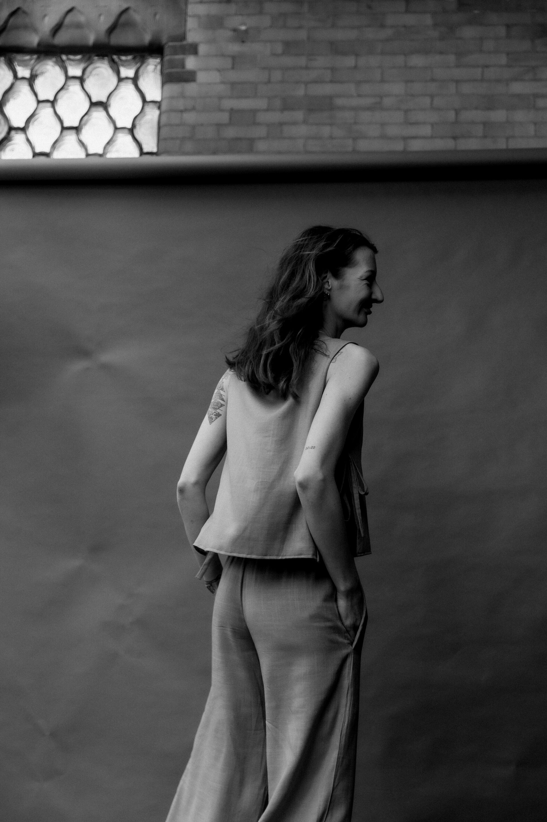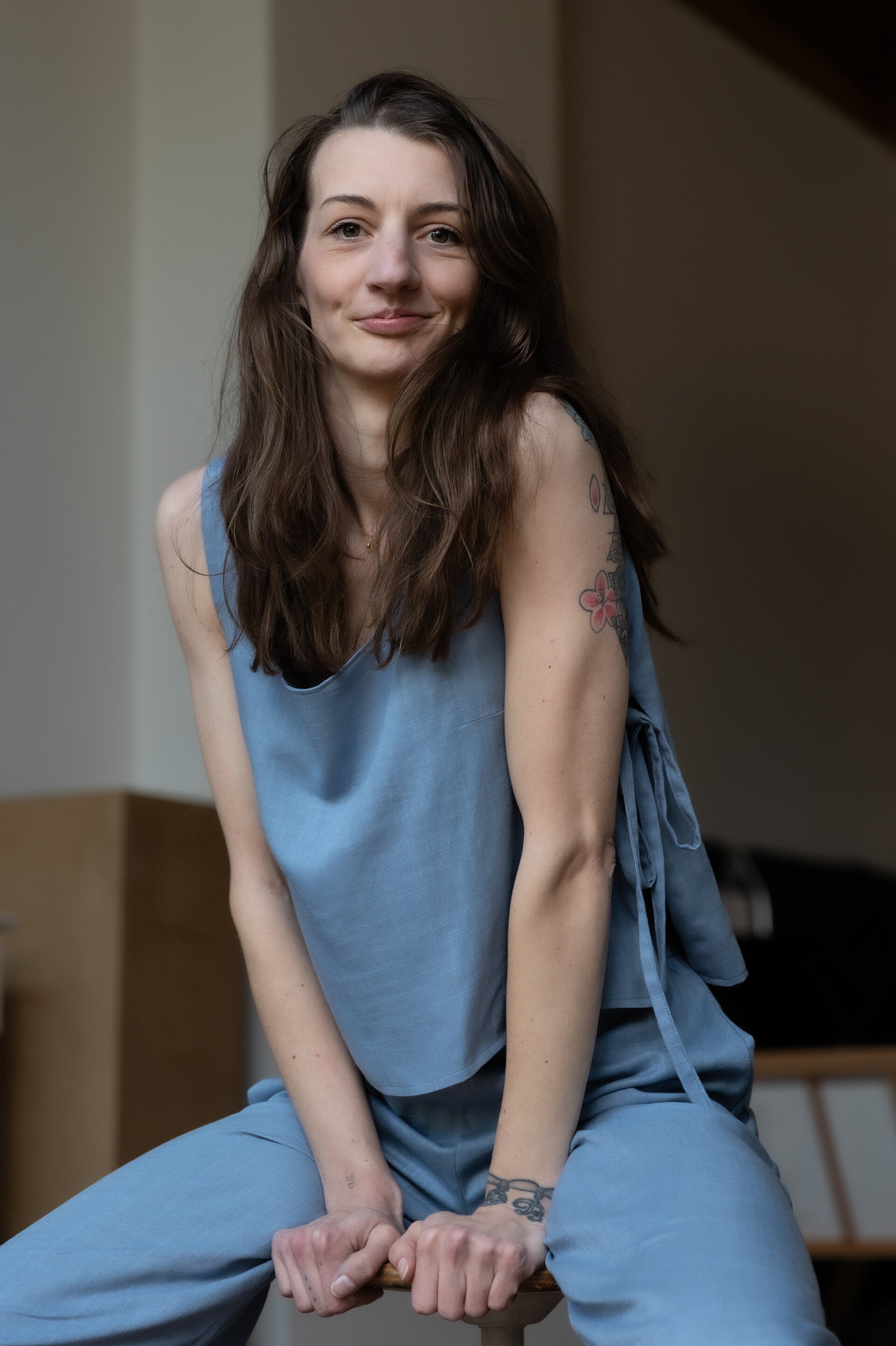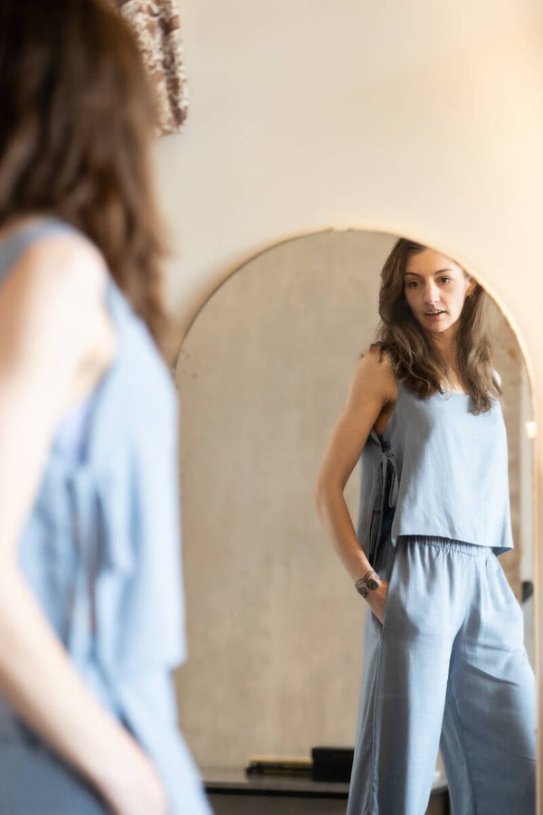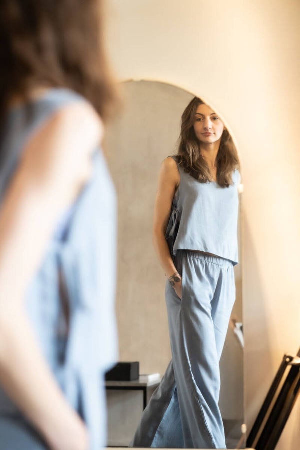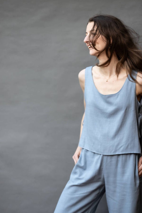 The cornflower (double) top is made from a deadstock linen viscose mix in the most beautiful color blue a real eye-catcher this summer