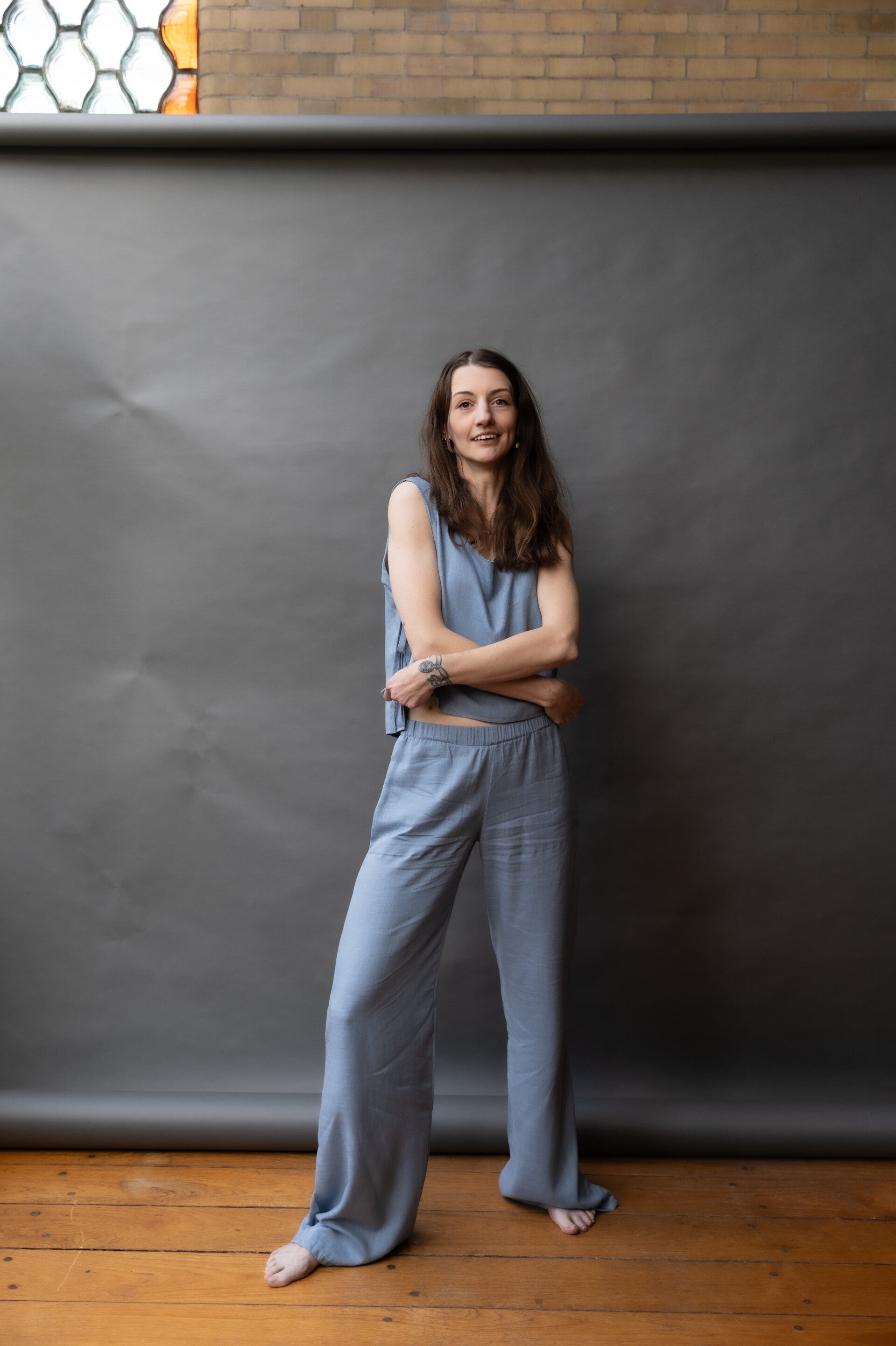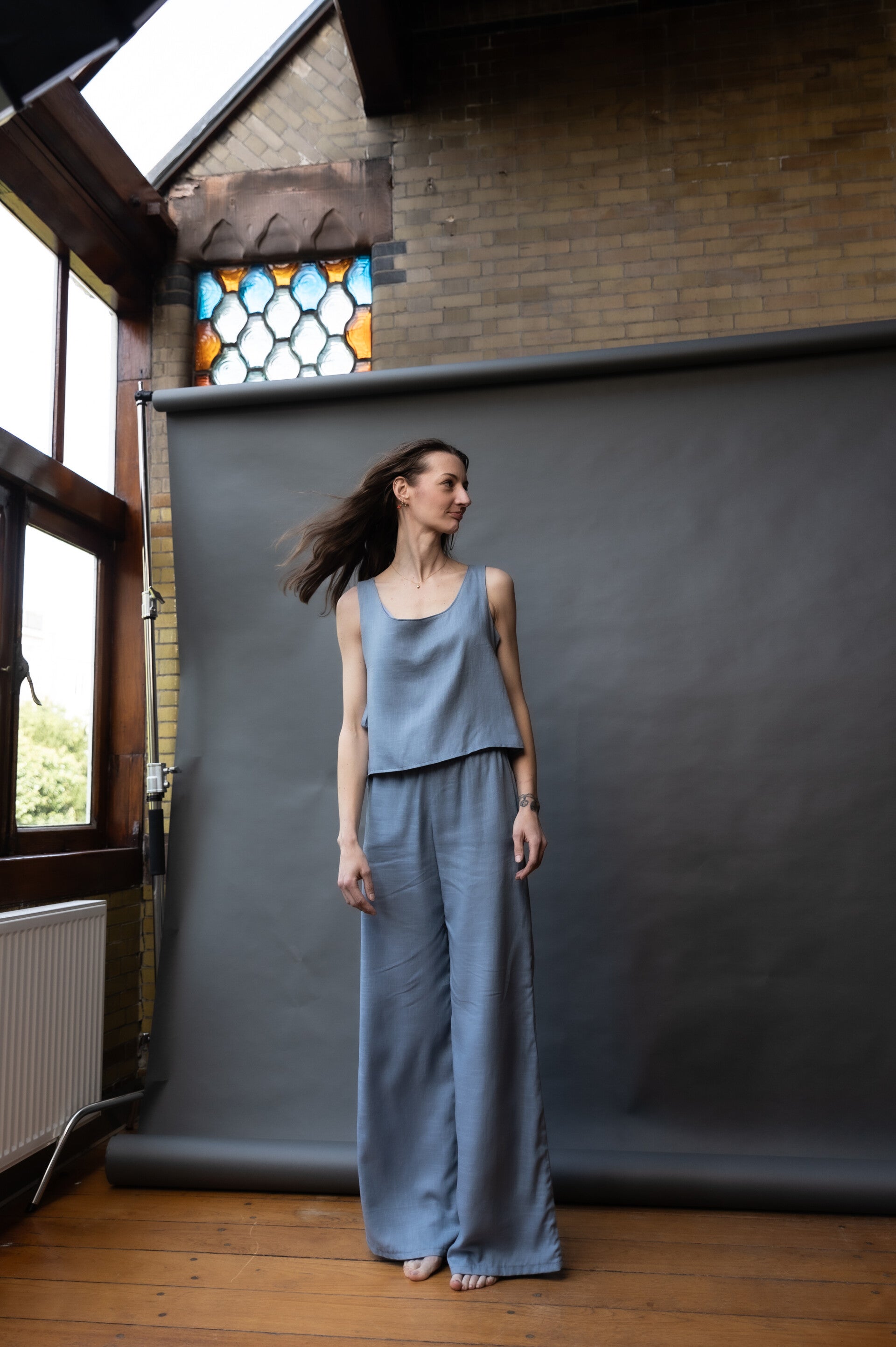 The cornflower pants is made from a deadstock linen viscose mix in the most beautiful color blue a real eye-catcher this summer