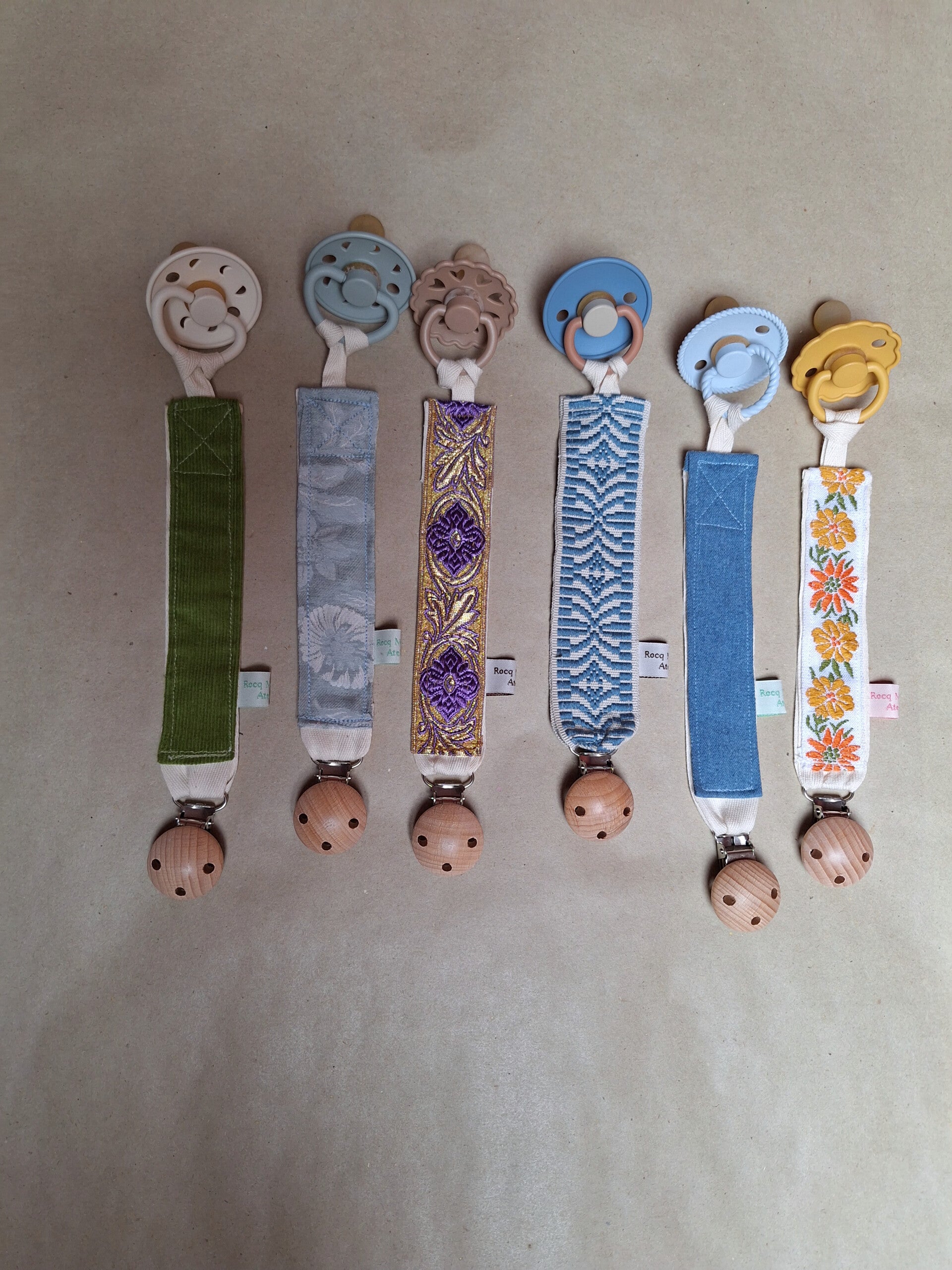 Alle speenkoorden worden gemaakt van overgebleven stoffen uit vorige collecties of vintage bandjes die we uit alle hoeken van de wereld gevonden hebben er komen er bijv ook een paar uit antwerpen en parijs.
