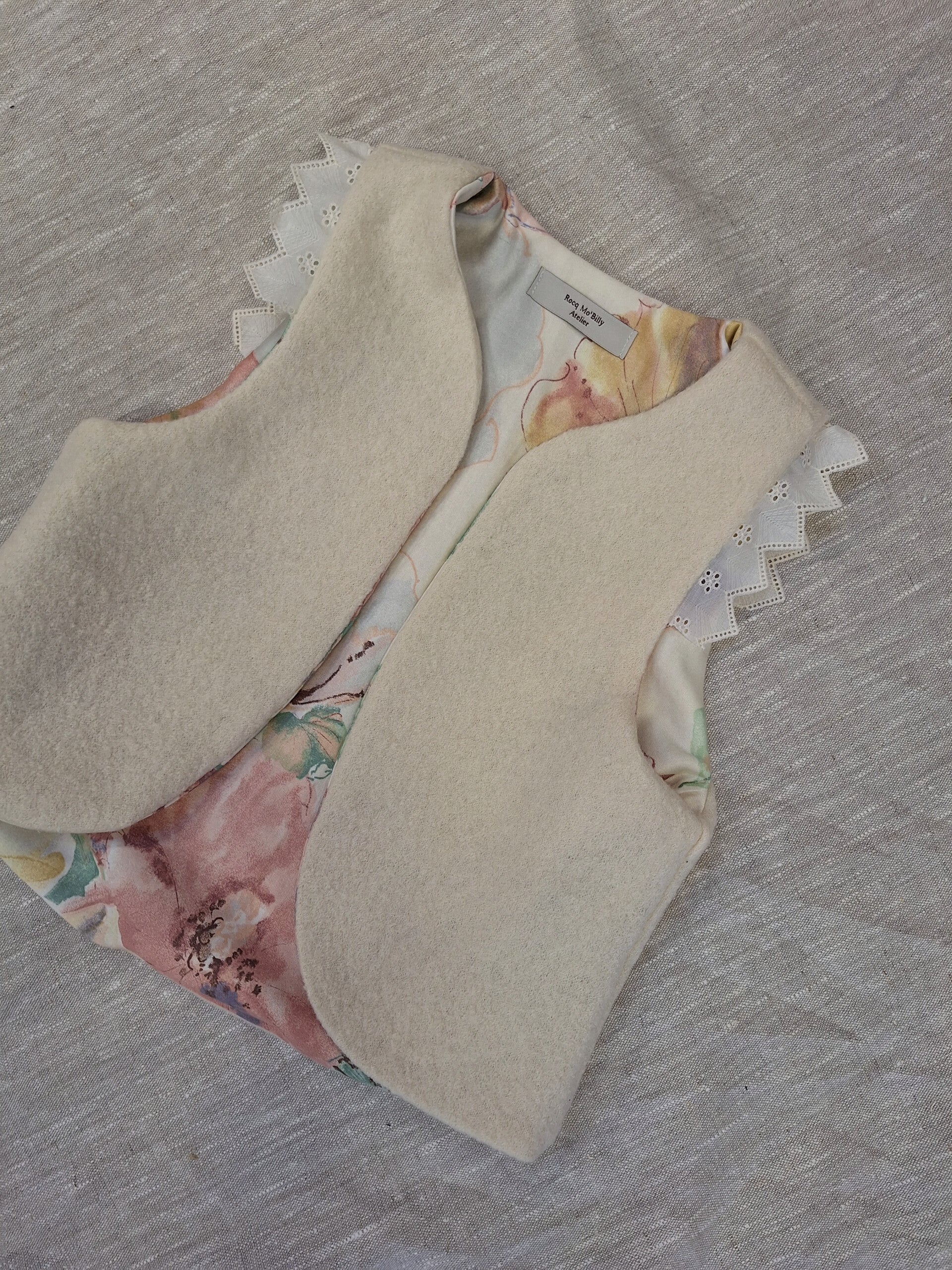 Dit gilet is meer dan een kledingstuk – het is een stukje nostalgie en vakmanschap. Met liefde gemaakt van crèmekleurige wol en gevoerd met een satijnkatoenen stof vol kleurrijke bloemen, afkomstig van een vintage gordijn uit de jaren '80. Elk gilet vertelt zijn eigen verhaal en is met aandacht voor detail ontworpen om je stijl en persoonlijkheid te laten stralen.