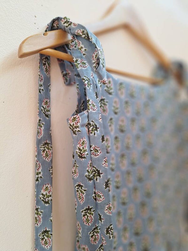 Alice awake is een jurk gemaakt van een 100% katoen poplin blockprint stof in de kleur Phoebe blues van de engelse makers Merchant and Mills