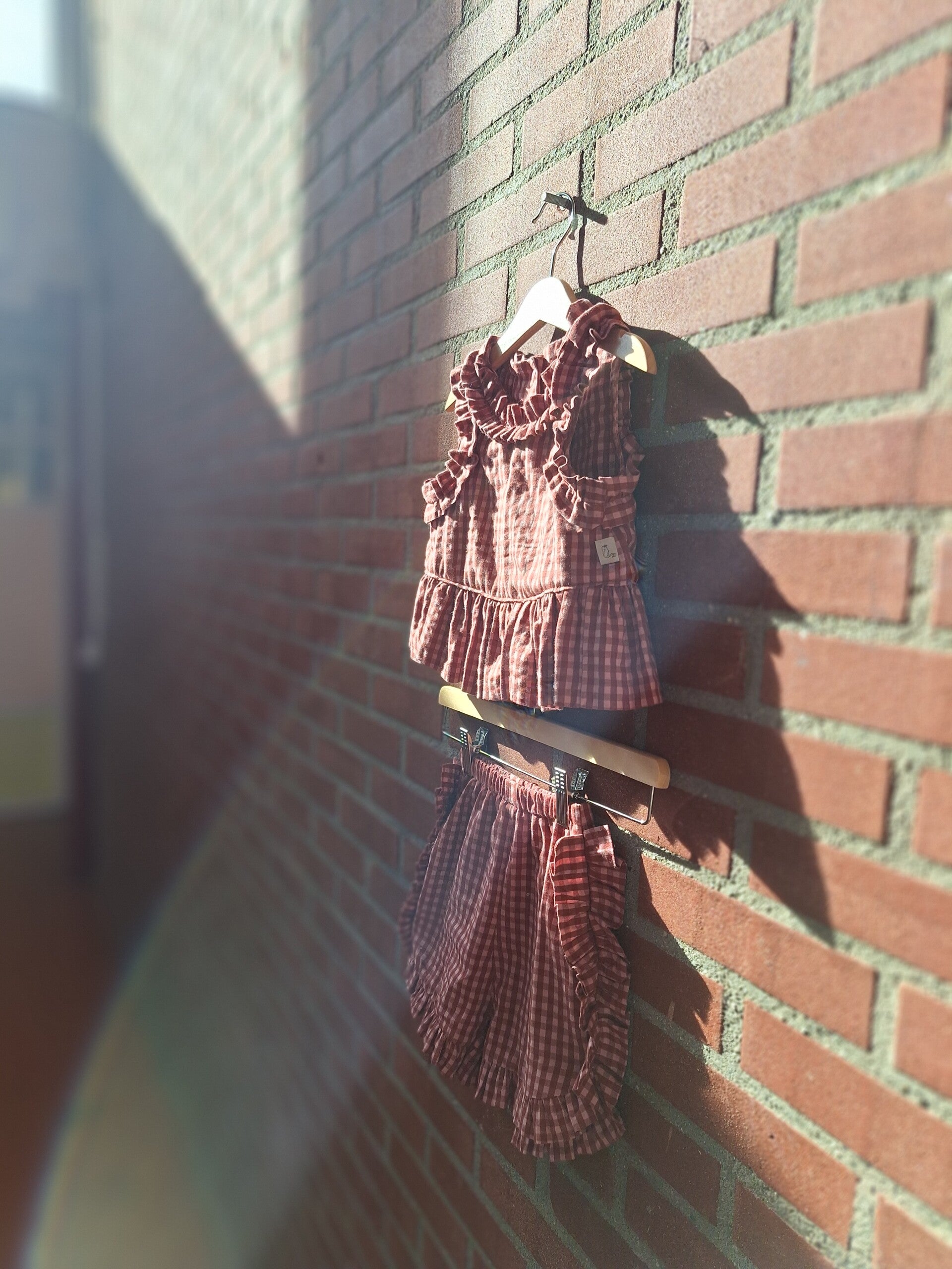 Een checkerd seersucker met de naam tea rose in de twee tonige kleur rood en rose zoals in de voorbeeld foto´s maar ook hebben we een leuke blockprint optie in checkerd met een fijn bloemetje in de kleuren bordeuax en creme dit model heeft extreem veel ruffels, wat deze set echt uniek maakt